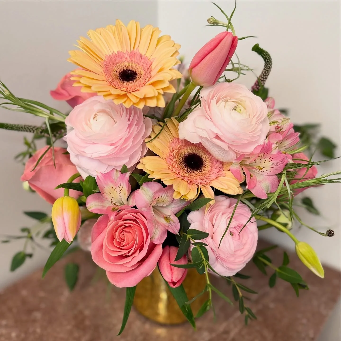 A bouquet of pink, peach, and yellow flowers in a gold vase, including roses, gerbera daisies, and lilies.